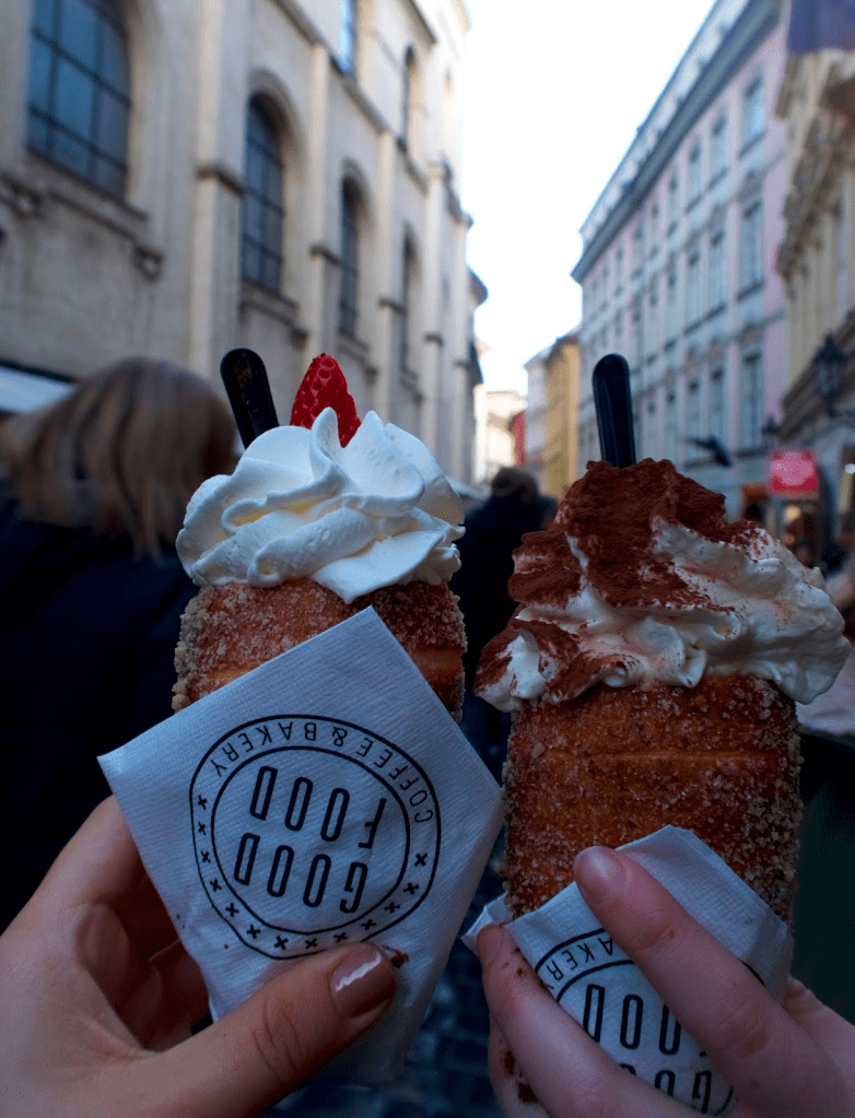 These magical deserts are called trdelniks and they are stuffed with delicious ice cream and other toppings! I found this place because they make them pretty, but there are so many vendors with them all over Prague, so you do not need to go to this specific place. I got whip cream in mine and it was not sweetened so it was interesting, but the breaded part was heavenly! Tip: Order ice cream for the inside!